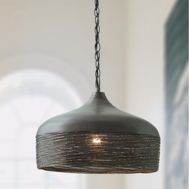 Evoking a star-studded sky this beautiful metal pendant light crafted of steel and finished in Grey Iron boasts intricate hand-wound wire detailing speckled with brass. The fixture comes alive as light filters through the gaps in the wire. The shapely dome shade creates statement-making contemporary or eclectic style in any room. Try it as a dining room fixture or in a conversation area in the living room.