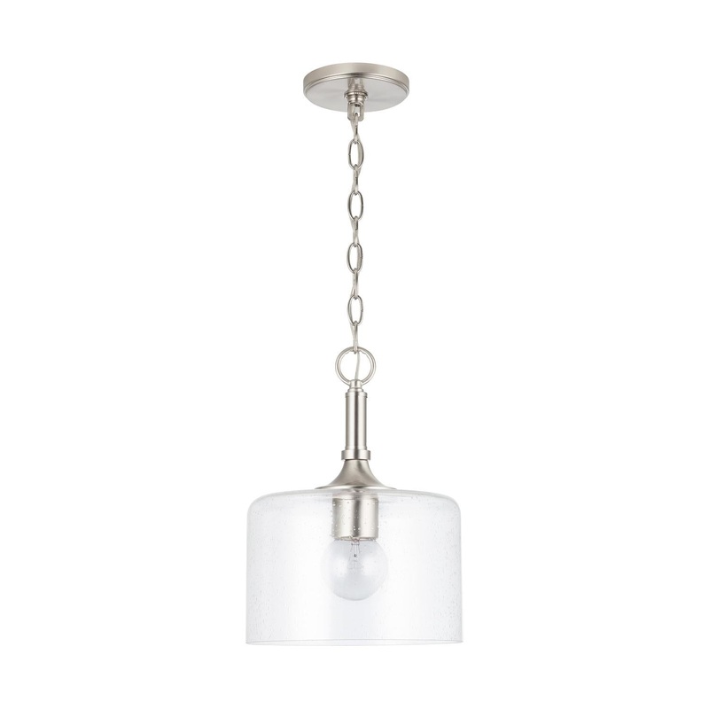 This simple pendant with elongated finial is versatile in style and size. The 10 inch wide seeded glass provides a subtle texture. Available in Brushed Nickel Matte Black or Bronze.