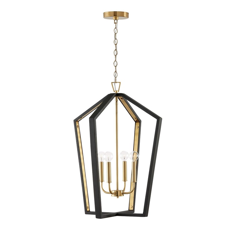 A sleek silhouette and intriguing details define the Maren Pendant. The bands of Matte Brass metal line the interior of the flat black painted mango wood creating an unexpected detail on the intersecting arms and casting a warm glow on the open-air frame.