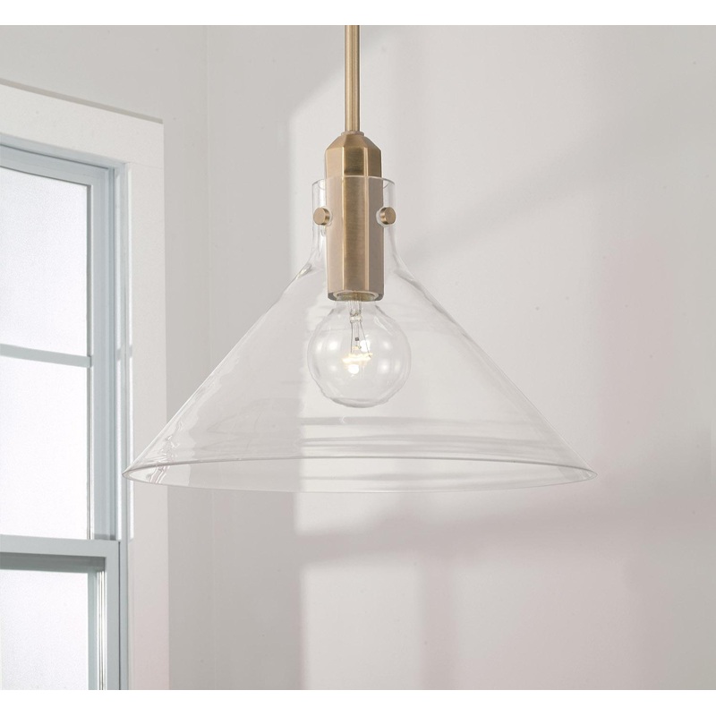 A modern take on midcentury style the Greer Pendant brings understated style to any space. The faceted socket and rivet details in Aged Brass adds a pop of personality to the tapered glass.