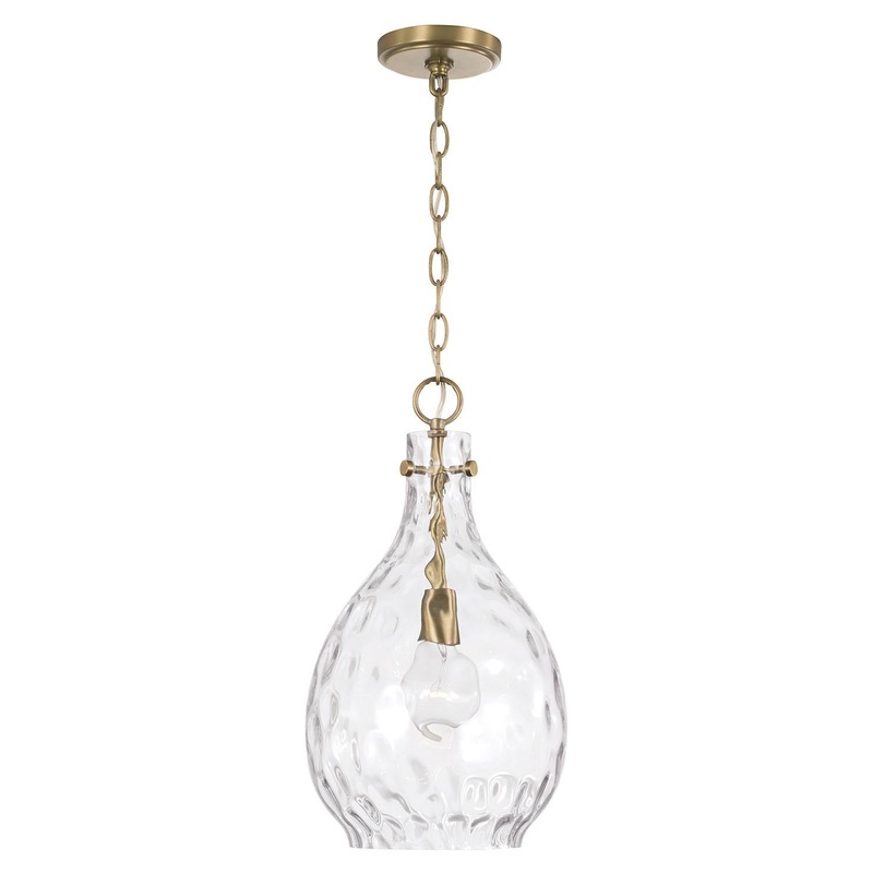 Chic curves and simple style create the Brentwood Pendant for HomePlace. The Aged Brass finish and water glass beautifully accent the pendant s teardrop shape bringing easy-on-the-eyes design to any space.