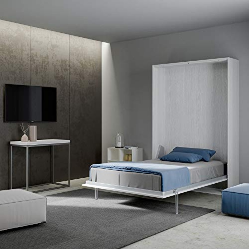 Dettagli: Letto a scomparsa verticale una piazza e mezza in color bianco frassino. Il meccanismo di apertura e chiusura assistito da pistoni a gas. La struttura in ferro verniciato e legno. Il letto Kentaro l'ideale in stanze da letto di piccole dimensioni