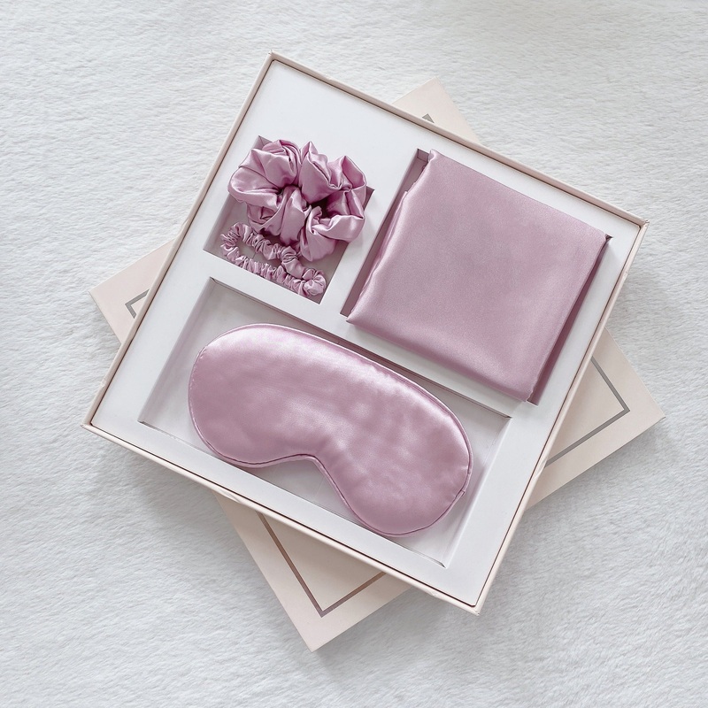 Luxury Satin Sleep Mask Gift Set - 4-Piece with Pillowcase and Hair Accessories Product Description Indulge in a restful night's sleep with this Luxury Satin Sleep Mask Gift Set. This 4-piece set includes a satin sleep mask, a pillowcase, and two hair acce