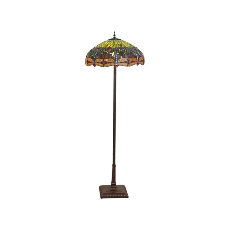 This Tiffany Hanginghead Dragonfly floor lamp features a stunning dragonfly motif crafted from multi-colored Lakeside Blue and Pond Green glass, accented with red jeweled eyes. The warm Mahogany Bronze steel base showcases the artisan copperfoil shade. UL listed for dry locations.