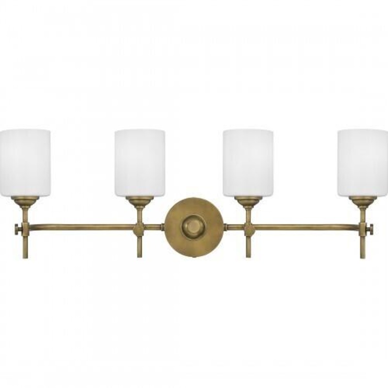 Complement your bathroom with the mid-century modern style of the Aria collection. Finished in a Weathered Brass, the thin arms and knob details give this fixture a retro, vintage feel. The opal etched glass shades diffuse light and provide a warm glow.