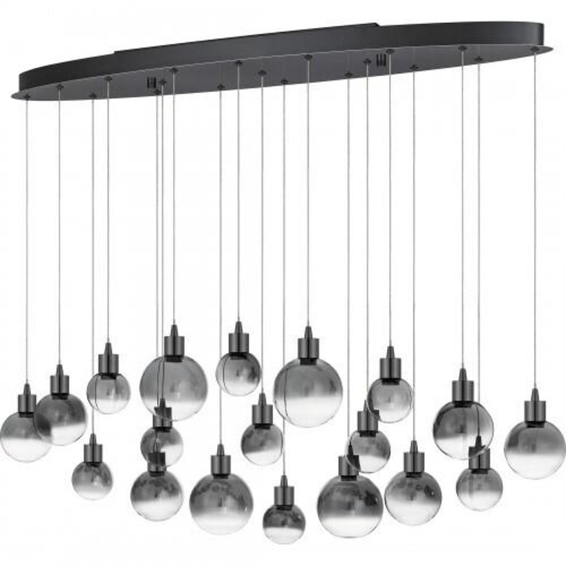 Take your living space to the next level with the contemporary style of the Shadow collection. The smoke glass shades come in multiple sizes and are suspended at staggered heights for a dramatic look. Finished in Black Chrome and constructed using integrated LED technology, this collection doubles as light source and a work of art.